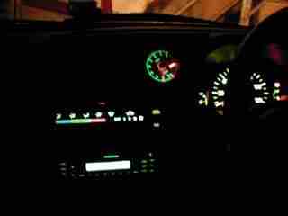 なかなかスペースがないし、取って付けたようなのはイヤだったので、エアコンの吹き出し口に埋め込んで出来上がりです。以前乗ってた車の時にブースト計を埋め込んだのですが、「結露」しちゃったので反省をふまえて、メーターの奥側と横の空いたスペースに発泡スチロールを切って結露対策しました。運の良いことに、イルミが純正色と同じグリーンでイイ感じです。
